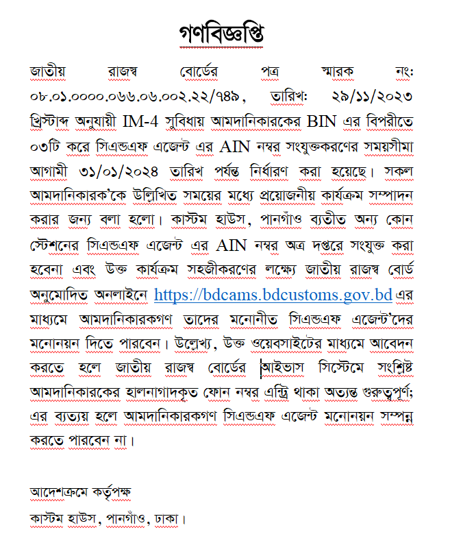 IM4 সুবিধায় আমদানীকারকের BIN এর বিপরীতে সিএন্ড এফ এজেন্ট এর AIN নম্বর সংযুক্তকরণের গণ বিজ্ঞপ্তি।