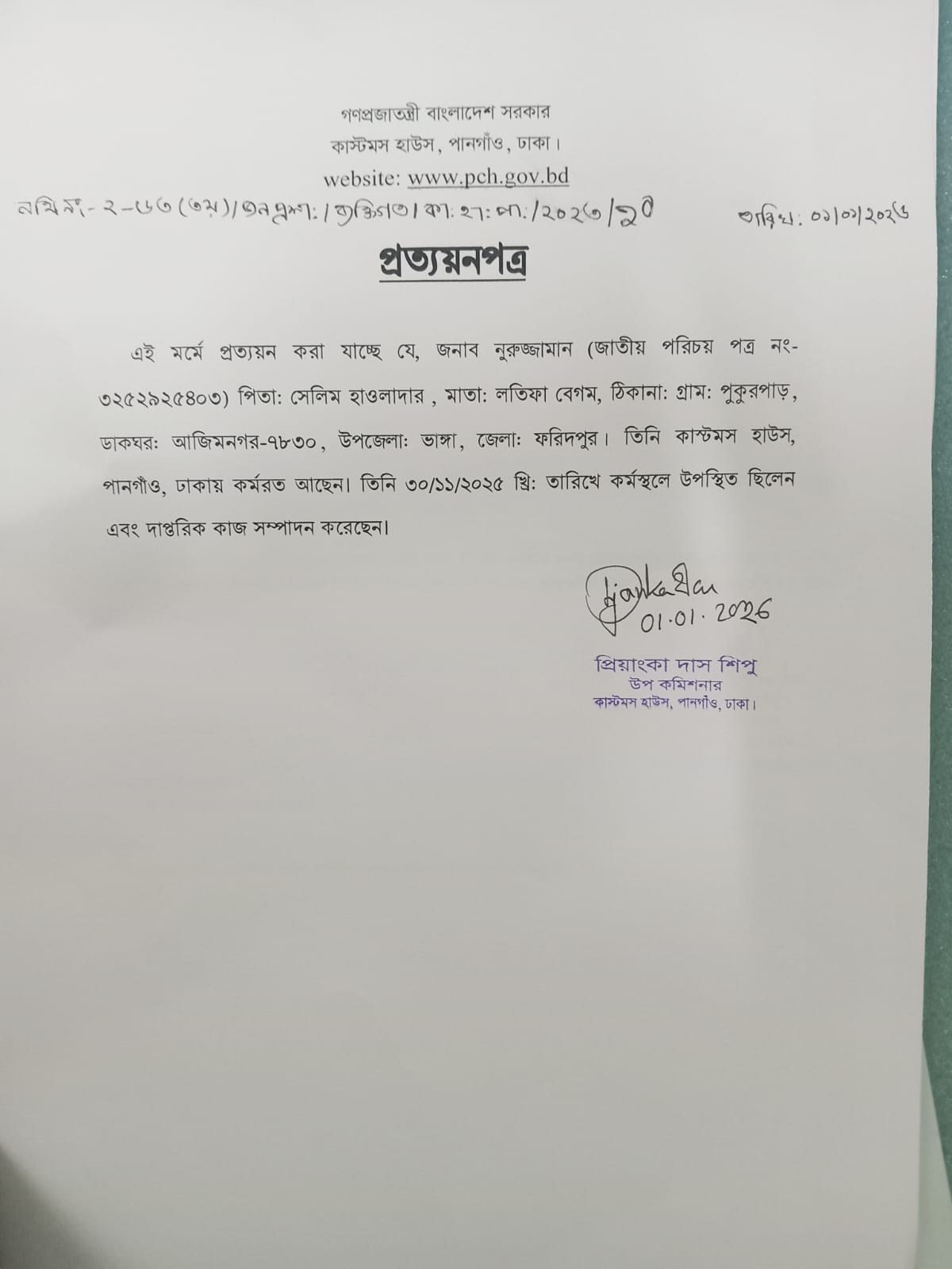 জনাব নুরুজ্জামান, সিপাই, এর প্রত্যয়ণ পত্র।